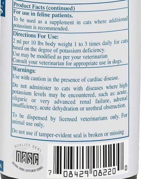 Rx Vitamins For Pets Amino B+K B-Complex with Potassium For Dogs and Cats 4 OZ delivers essential B-complex vitamins and potassium gluconate in a palatable liquid format. Each 2 ml serving provides 2 mEq of potassium gluconate along with a proprietary amino acid blend, vitamins, and minerals to help support daily wellness. Rx Vitamins For Pets Amino B+K is flavored with liver and bacon for easy administration and includes a plastic dropper for accurate dosing. This formula helps support energy metabolism, nutrient utilization, and overall vitality in cats and dogs.
